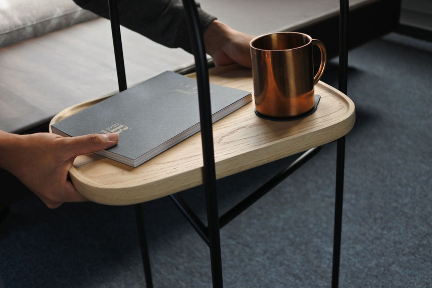 Afternoon邊几半月拱型的提籃外型,有如英式下午茶的點心籃,能隨意地提起、變換位置,托盤亦可分開使用,靈活的機能使空間多變而活潑。採用金屬架構搭配上溫潤的白橡木盤面,經典沉穩的配色和有趣的外型,有別於很多可以提起的邊几,Afternoon邊几在構思上選擇可以單手提起,但不做出明顯的提把造型,著重在整體造型的完整性。